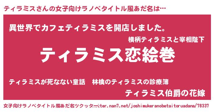 ティラミスさんの女子向けラノベタイトル風あだ名は… 『ティラミス恋絵巻』『異世界でカフェティラミスを開店しました。』『ティラミス伯爵の花嫁』 ツクッター #女子向けラノベタイトル風あだ名ツクッター http://tkutter.nan7.net/joshimukeranobetaitoruadana/78337/