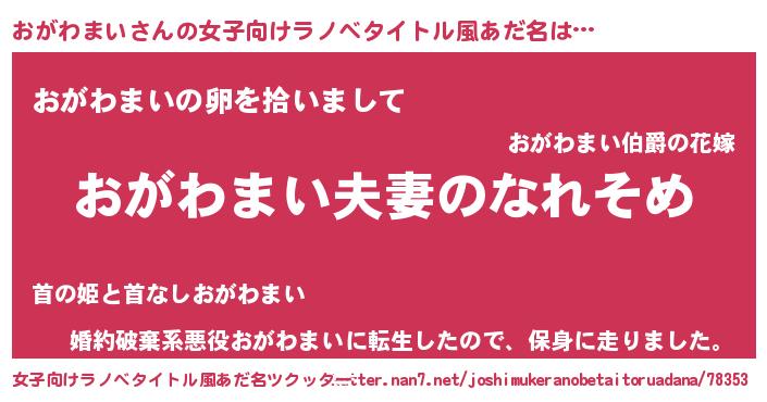 | 男性向けラノベタイトル風あだ名 | 『おまえをオタクにしてやるから、俺をおがわまいにしてくれ! 』 |