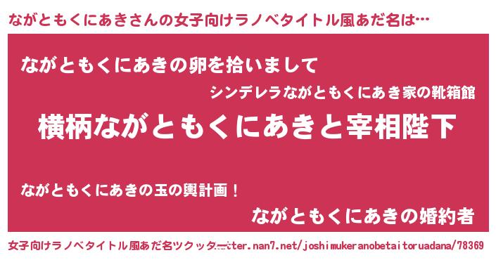 | 男性向けラノベタイトル風あだ名 | 『ながともくにあきに滅ぼされるだけの簡単なお仕事です』 |