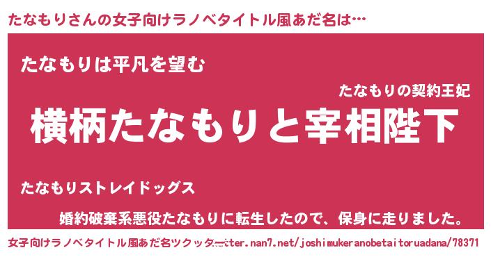 | 男性向けラノベタイトル風あだ名 | 『たなもりに滅ぼされるだけの簡単なお仕事です』 |