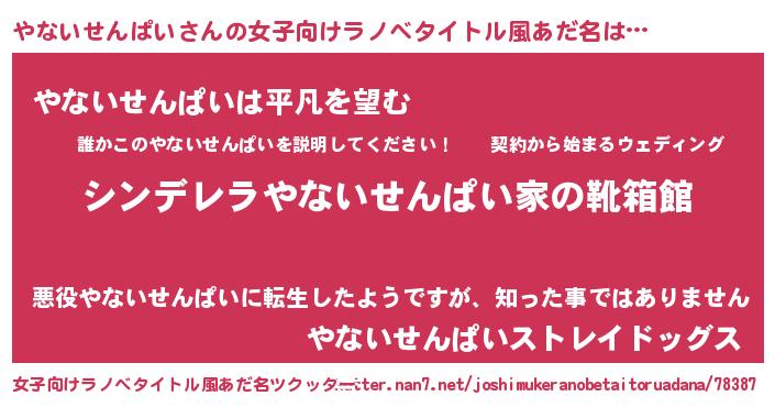 | 胡散臭い通販商品みたいなあだ名 | 『信頼と実績のサプリメント…その名も「やないせんぱい」』 |