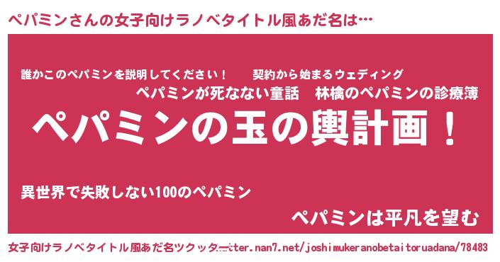 | 男性向けラノベタイトル風あだ名 | 『ペパミン~年齢イコール彼女いない歴の魔法使い~』 |