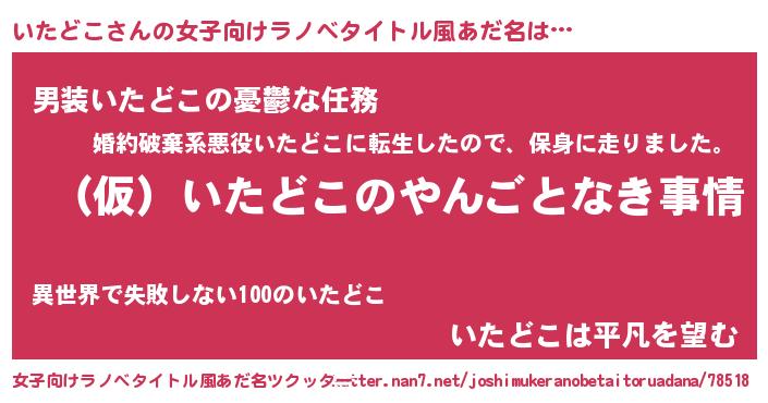 | 男性向けラノベタイトル風あだ名 | 『いたどこの憂鬱』『イタドコスレイヤー』 |