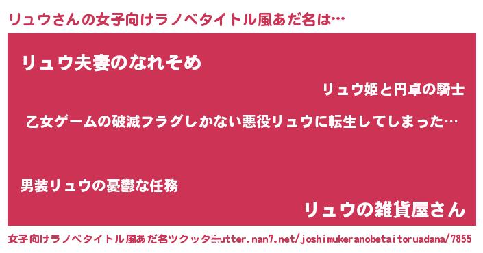 | 男性向けラノベタイトル風あだ名 | 『この素晴らしい世界にリュウを!』 |