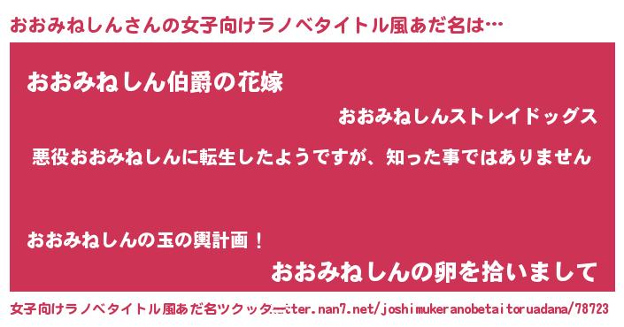 | 男性向けラノベタイトル風あだ名 | 『この素晴らしい世界におおみねしんを!』 |