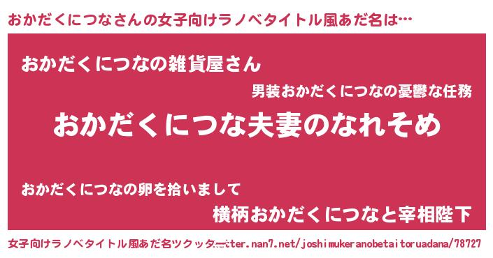 | 男性向けラノベタイトル風あだ名 | 『おまえをオタクにしてやるから、俺をおかだくにつなにしてくれ! 』 |