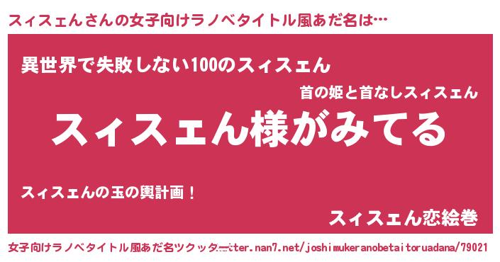 | 男性向けラノベタイトル風あだ名 | 『スィスェんの嫁は女の子じゃないと思った?』 |