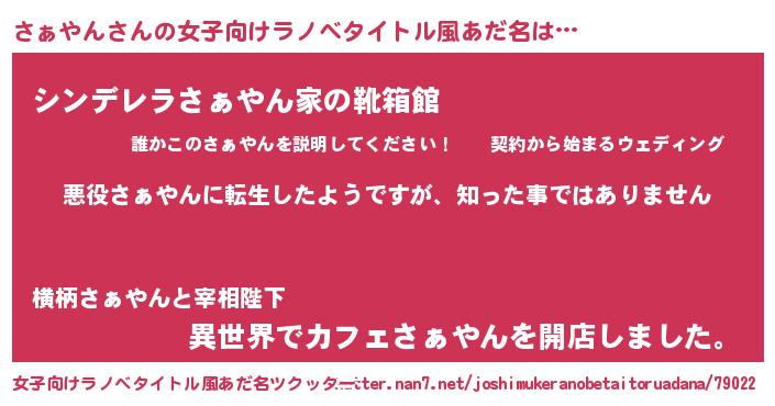 | 男性向けラノベタイトル風あだ名 | 『この素晴らしい世界にさぁやんを!』 |