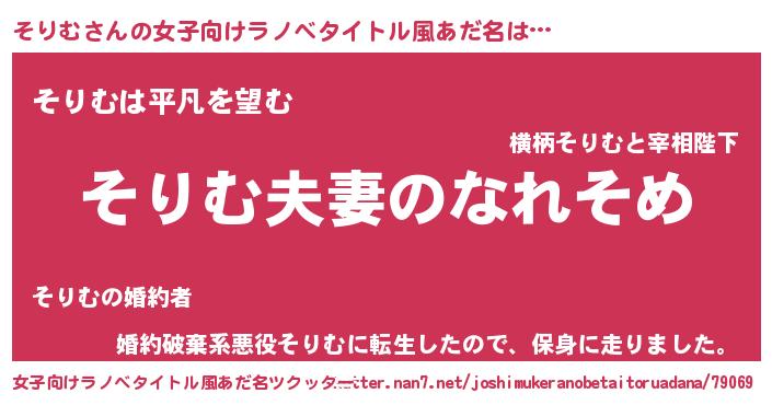 | 男性向けラノベタイトル風あだ名 | 『おまえをオタクにしてやるから、俺をそりむにしてくれ! 』 |