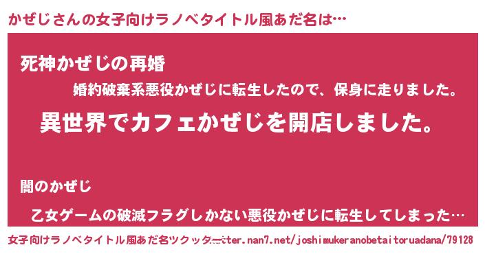 | 男性向けラノベタイトル風あだ名 | 『誰もが恐れるあのかぜじが、ぼくの専属メイドになるようです。』 |