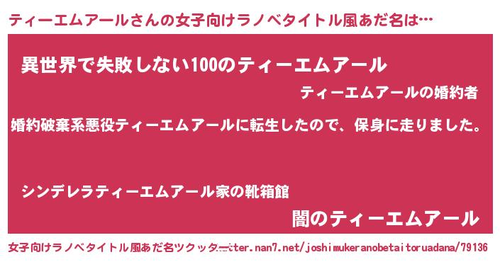 | 男性向けラノベタイトル風あだ名 | 『ティーエムアールスレイヤー』 |