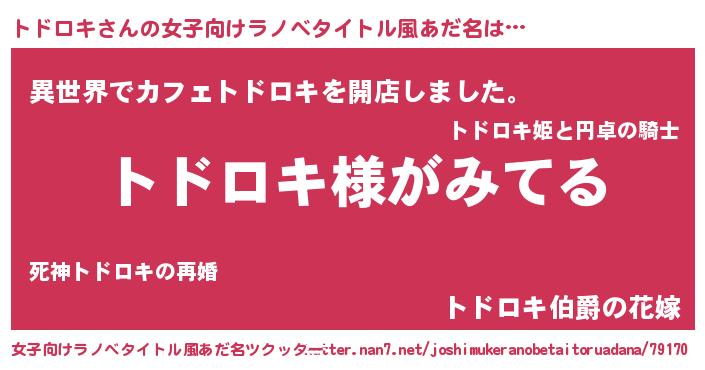| 男性向けラノベタイトル風あだ名 | 『トドロキの嫁は女の子じゃないと思った?』 |