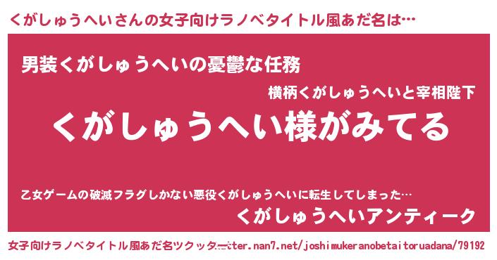 | 男性向けラノベタイトル風あだ名 | 『くがしゅうへいの嫁は女の子じゃないと思った?』 |