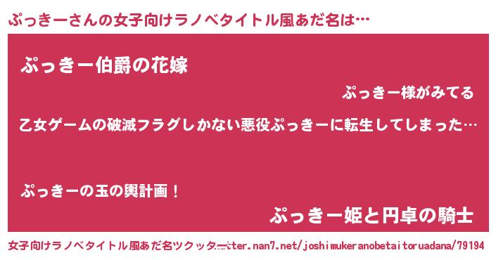 | 男性向けラノベタイトル風あだ名 | 『この素晴らしい世界にぷっきーを!』 |