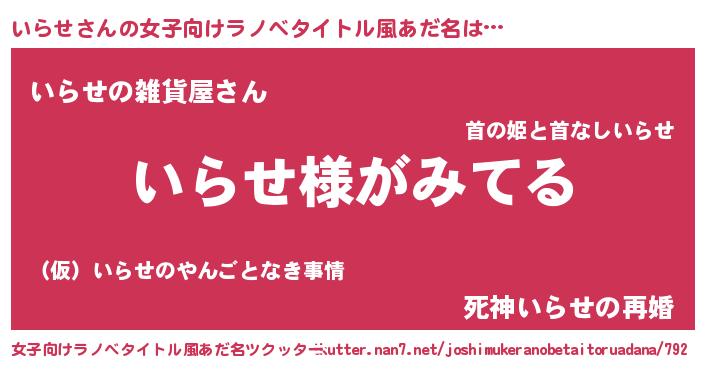 | 男性向けラノベタイトル風あだ名 | 『いらせの嫁は女の子じゃないと思った?』 |