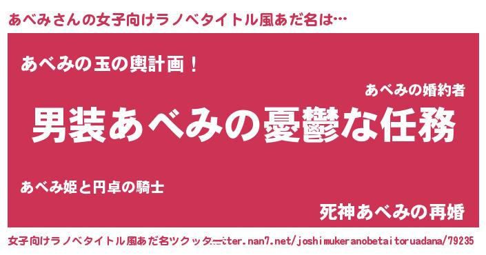 | 男性向けラノベタイトル風あだ名 | 『うちのあべみが世界を掌握している!』 |