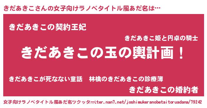 | 男性向けラノベタイトル風あだ名 | 『きだあきこ~年齢イコール彼女いない歴の魔法使い~』 |