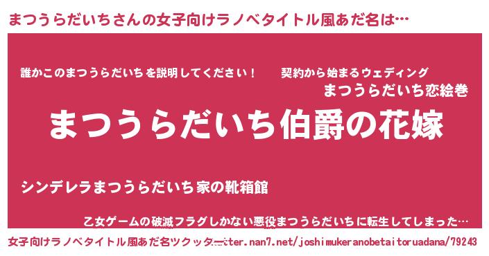 | 男性向けラノベタイトル風あだ名 | 『うちの娘の為ならば、俺はもしかしたらまつうらだいちも倒せるかもしれない。』 |