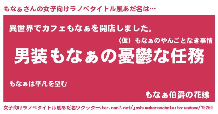 | 胡散臭い通販商品みたいなあだ名 | 『来世でも幸せになれる水素水…その名も「もなぁ」』 |