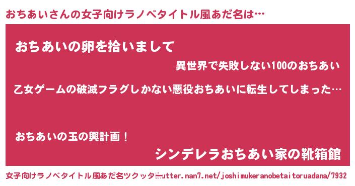 | 男性向けラノベタイトル風あだ名 | 『この素晴らしい世界におちあいを!』 |