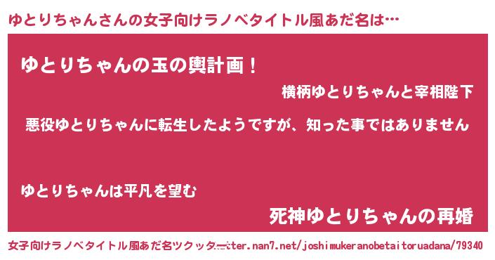 | 男性向けラノベタイトル風あだ名 | 『この素晴らしい世界にゆとりちゃんを!』 |