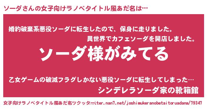 | 男性向けラノベタイトル風あだ名 | 『ソーダの嫁は女の子じゃないと思った?』 |