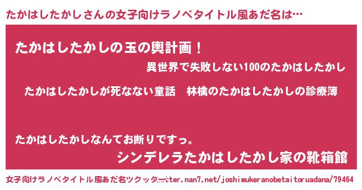 | 男性向けラノベタイトル風あだ名 | 『魔弾の王とたかはしたかし』 |