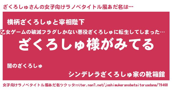 ざくろしゅさんの女子向けラノベタイトル風あだ名は… 『ざくろしゅ様がみてる』『横柄ざくろしゅと宰相陛下』『シンデレラざくろしゅ家の靴箱館』 ツクッター #女子向けラノベタイトル風あだ名ツクッター http://tkutter.nan7.net/joshimukeranobetaitoruadana/79468/