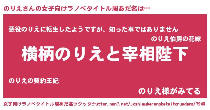 | 男性向けラノベタイトル風あだ名 | 『のりえに滅ぼされるだけの簡単なお仕事です』 |