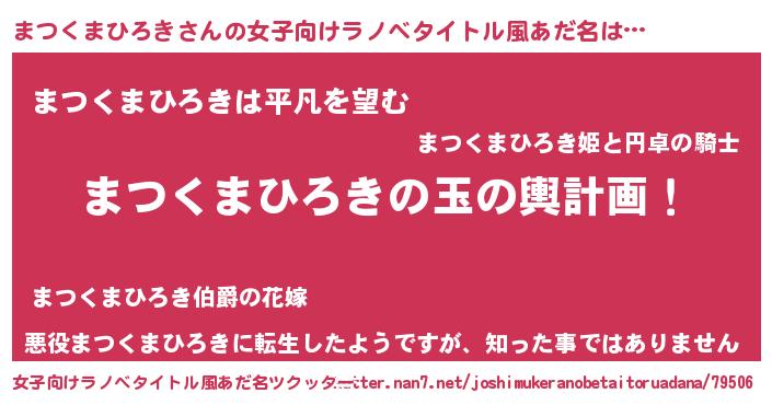 まつくまひろきさんの女子向けラノベタイトル風あだ名は… 『まつくまひろきの玉の輿計画!』『まつくまひろきは平凡を望む』『悪役まつくまひろきに転生したようですが、知った事ではありません』 ツクッター #女子向けラノベタイトル風あだ名ツクッター http://tkutter.nan7.net/joshimukeranobetaitoruadana/79506/