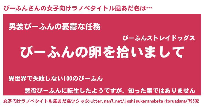 | 男性向けラノベタイトル風あだ名 | 『びーふんの嫁は女の子じゃないと思った?』 |