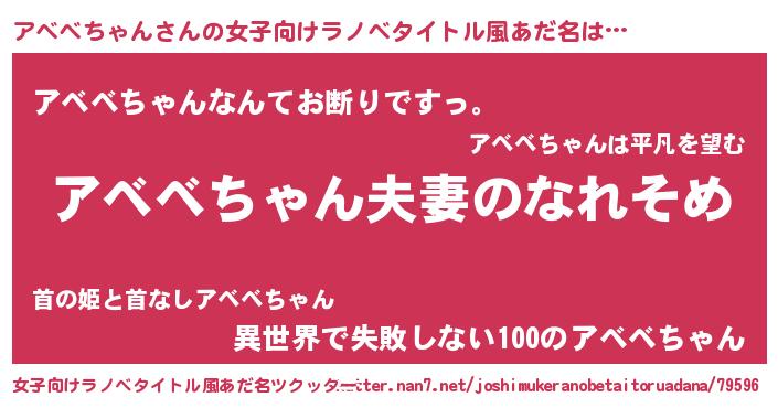 | 男性向けラノベタイトル風あだ名 | 『おまえをオタクにしてやるから、俺をアベベちゃんにしてくれ! 』 |