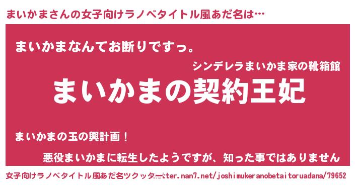 | 男性向けラノベタイトル風あだ名 | 『誰もが恐れるあのまいかまが、ぼくの専属メイドになるようです。』 |