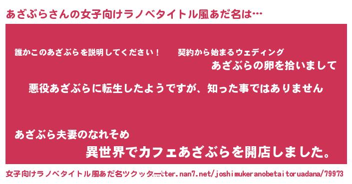 | 男性向けラノベタイトル風あだ名 | 『この素晴らしい世界にあざぶらを!』 |