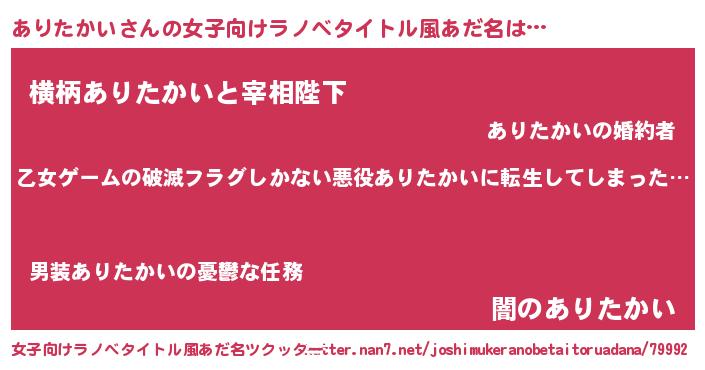 | 胡散臭い通販商品みたいなあだ名 | 『世界中を虜にした100年もののヴィンテージワイン…その名も「ありたかい」』 |