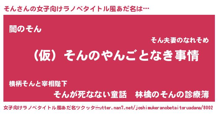| 男性向けラノベタイトル風あだ名 | 『そんの憂鬱』『魔弾の王とそん』 |