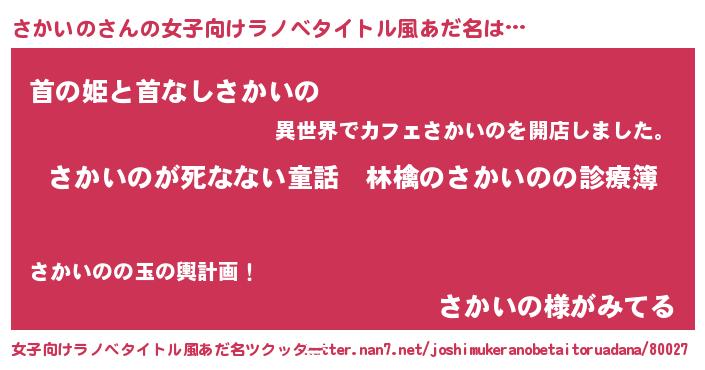 | 男性向けラノベタイトル風あだ名 | 『魔弾の王とさかいの』 |