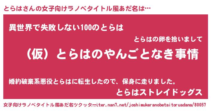 | 男性向けラノベタイトル風あだ名 | 『とらはの憂鬱』『トラハスレイヤー』 |