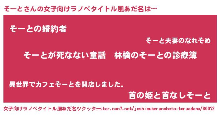 | 男性向けラノベタイトル風あだ名 | 『魔弾の王とそーと』 |