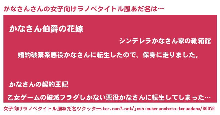 | 男性向けラノベタイトル風あだ名 | 『カナサンスレイヤー』 |
