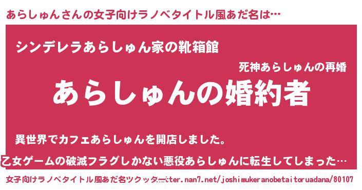 | 胡散臭い通販商品みたいなあだ名 | 『運命の人と巡り会える高級そうな絵画…その名も「あらしゅん」』 |