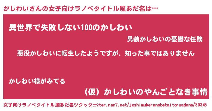 | 男性向けラノベタイトル風あだ名 | 『この素晴らしい世界にかしわいを!』 |