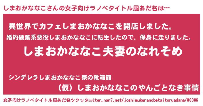 | 男性向けラノベタイトル風あだ名 | 『おまえをオタクにしてやるから、俺をしまおかななこにしてくれ! 』 |