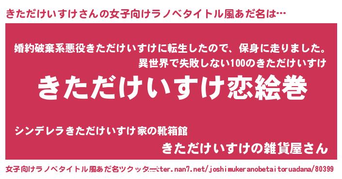| 男性向けラノベタイトル風あだ名 | 『おまえをオタクにしてやるから、俺をきただけいすけにしてくれ! 』 |