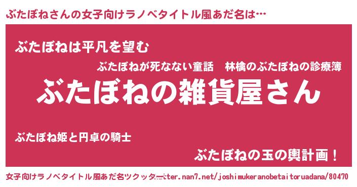 | 男性向けラノベタイトル風あだ名 | 『やはりぶたぼねの青春ラブコメはまちがっている 』 |