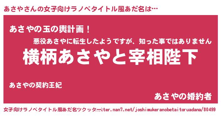 | 男性向けラノベタイトル風あだ名 | 『あさやに滅ぼされるだけの簡単なお仕事です』 |