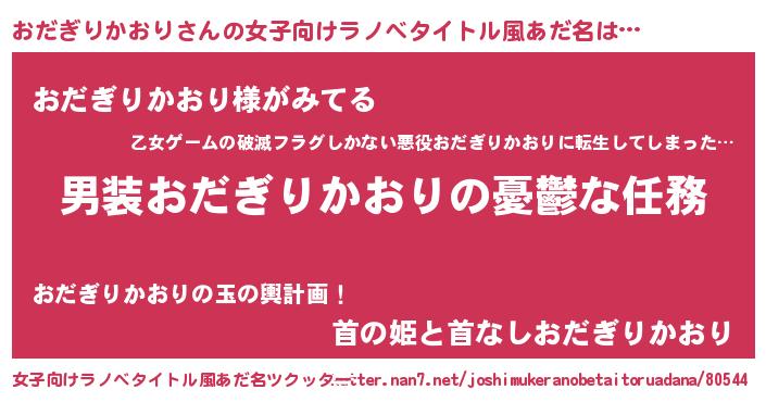 | 男性向けラノベタイトル風あだ名 | 『うちのおだぎりかおりが世界を掌握している!』 |