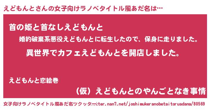 えどもんとさんの女子向けラノベタイトル風あだ名は… 『異世界でカフェえどもんとを開店しました。』『首の姫と首なしえどもんと』『(仮)えどもんとのやんごとなき事情』 ツクッター #女子向けラノベタイトル風あだ名ツクッター http://tkutter.nan7.net/joshimukeranobetaitoruadana/80569/