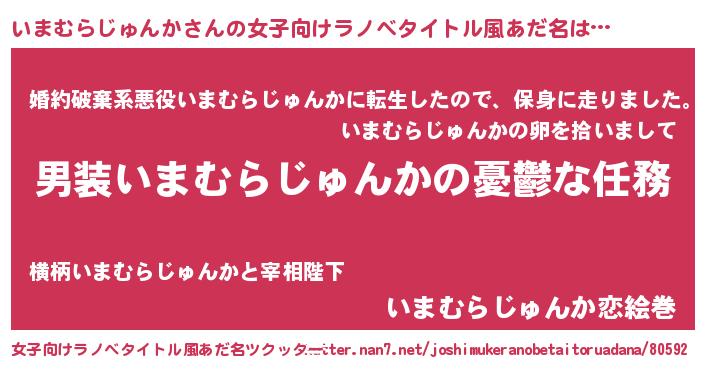 | 男性向けラノベタイトル風あだ名 | 『冴えないいまむらじゅんかの育てかた』 |