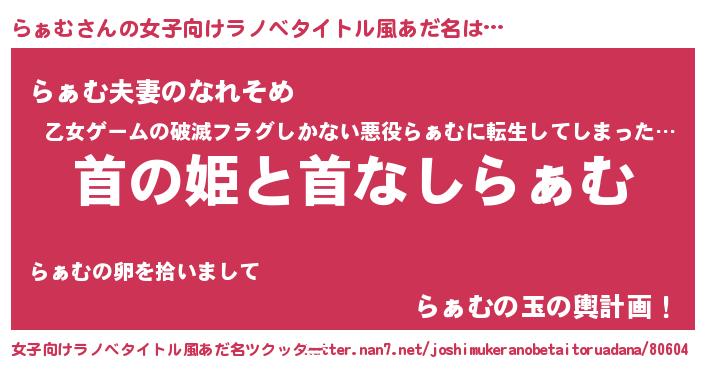 | 男性向けラノベタイトル風あだ名 | 『はたらくらぁむさま!』 |